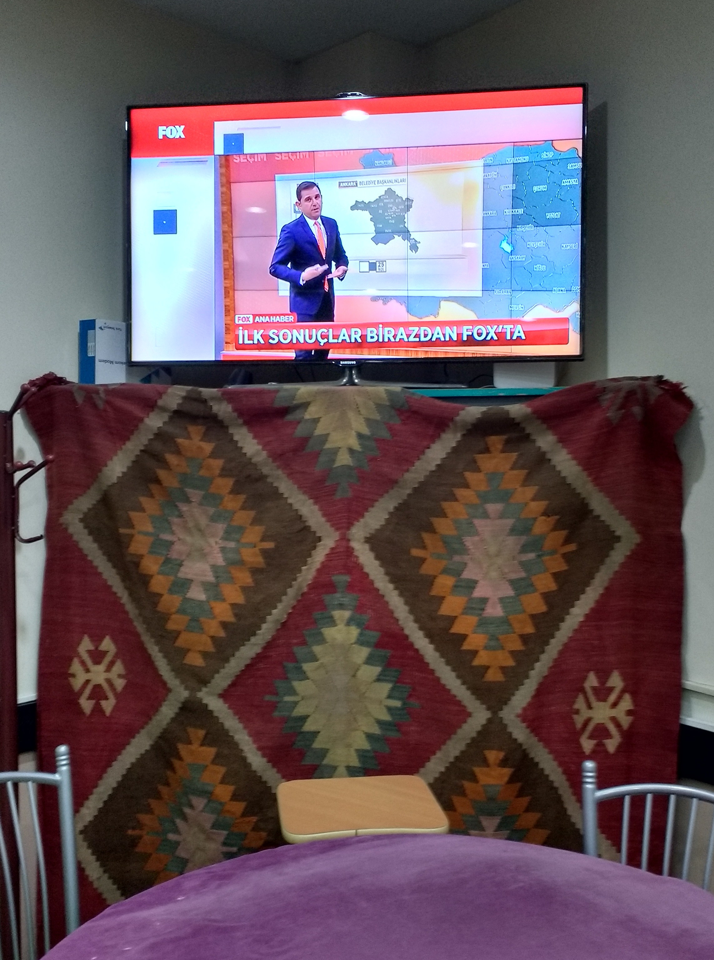 I will not comment on the election results, but here is a photo taken in the tea house. A modern flat screen TV, playing Fox news with the headline: First results soon on Fox news . Just below the TV, you can see a traditional Turkish rug, with geometric patterns, used to cover what I assume is quite an uninteresting cupboard.