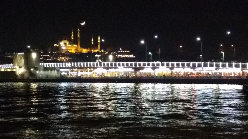 In this photo: A slightly blurred view of Istanbul’s Süleymaniye Mosque and the Galata Bridge at night.